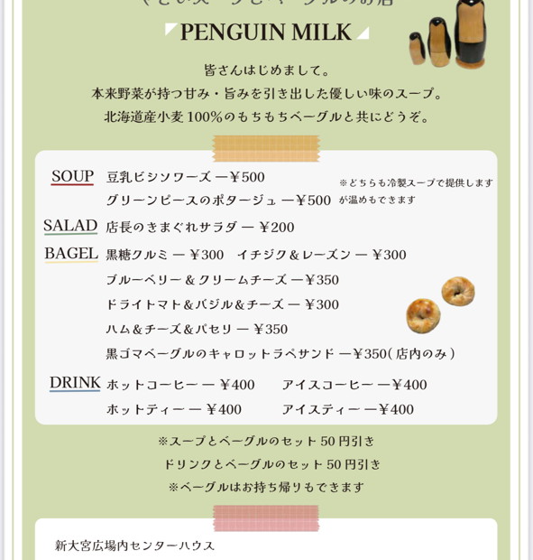 このたび野菜スープとベーグルの店『PENGUIN MILK』をオープンすることになりました